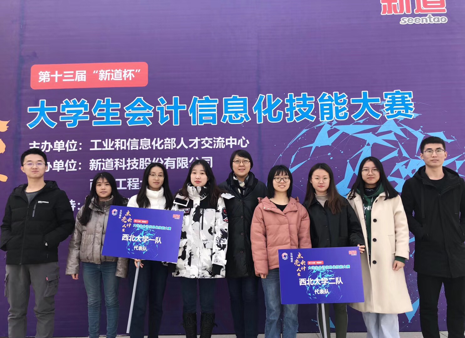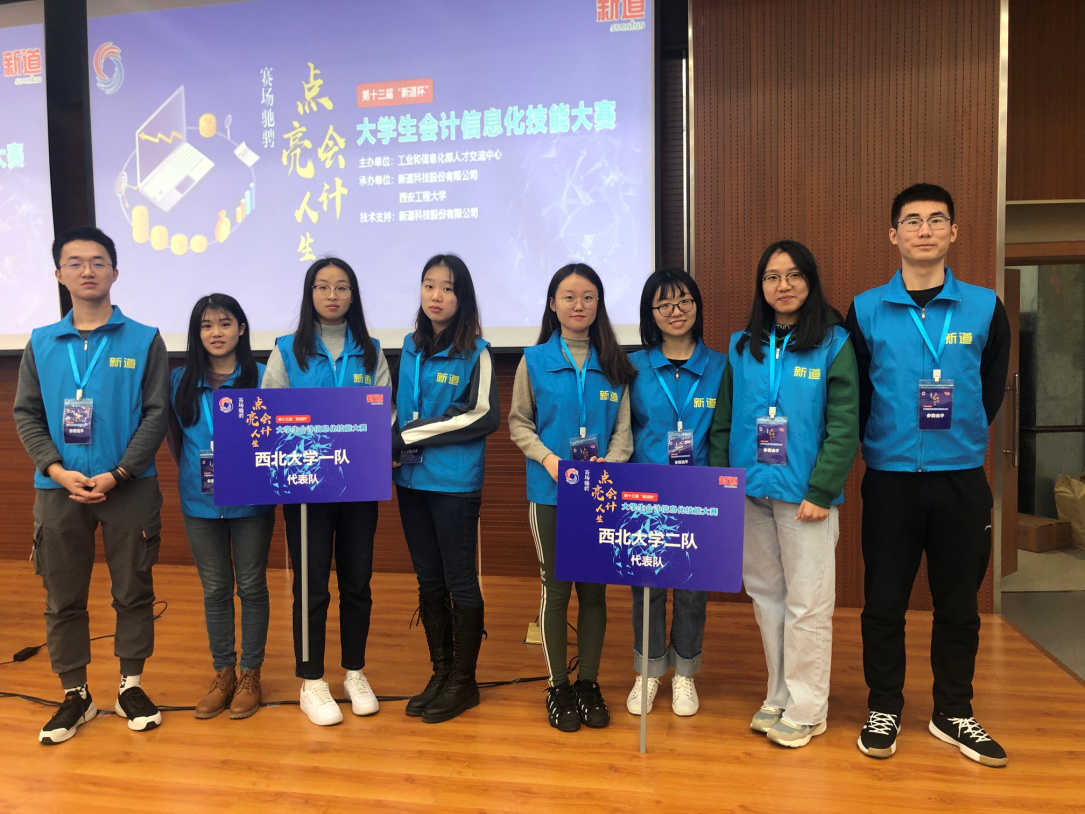 2019年12月7日,李辉老师和潘颖老师带领2017级会计班8名同学(万军、刘红娟、杨秋凤、李宇初、张帅、韩洁琳、闫晴、王露)于西安工程大学临潼校区参加了第十三届“新道杯”大学生会计信息化技能大赛,这8名同学组成两队代表yl7703永利集团参赛,在大赛中脱颖而出均获得团体一等奖。