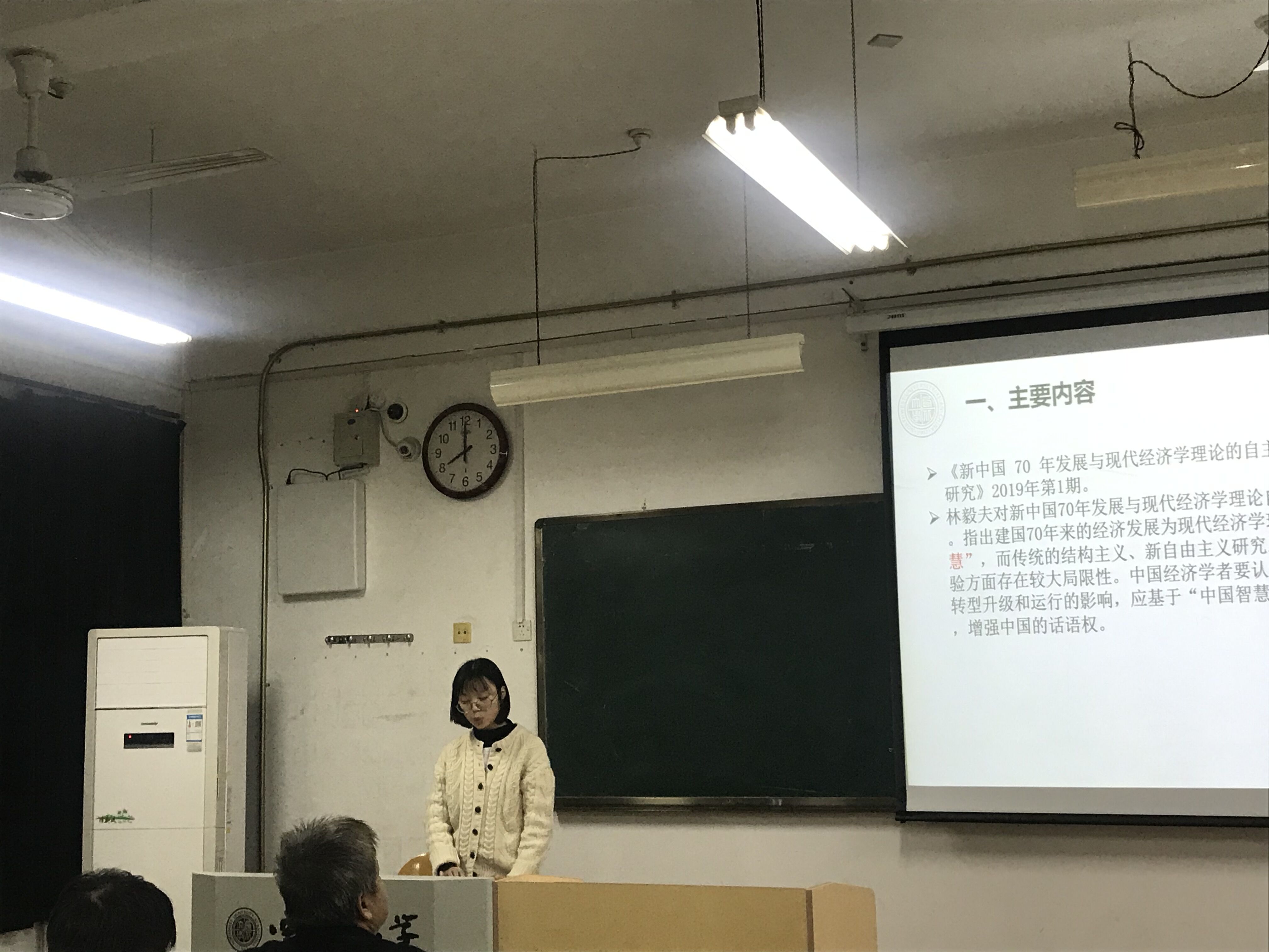 “基地学术课堂”的第二单元为文献研习,2017级经济学基地班本科生史亚萍讲解了《宏观质量研究》2019年第1期文章《新中国70年发展与现代经济学理论的自主创新》,由2018级经济学基地班本科生黄景彦对该篇文章进行了评论。