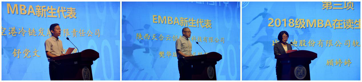 教师代表陈实副教授为新生寄语,希望同学们以虚心、用心、乐心的态度认真学习,博学审问、慎思明辨,让成绩不复以往,成就不负新时代。2018级在校生代表顾婷婷、2019级新生代表舒党文、樊华瑞分别代表在校生和2019级新生发言。
