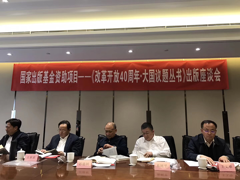 在庆祝改革开放40周年、喜迎新中国成立70周年之际,由重庆大学出版社和重庆智库联合策划出版的“改革开放40周年·大国议题丛书”出版座谈会近日在京举行。中央党校(国家行政学院)副校(院)长王东京教授、国家出版基金规划管理办公室副主任祁德树,以及丛书作者代表、审稿专家代表、特邀专家等40余人出席座谈会。我院白永秀教授作为丛书作者代表参加会议,学院党委书记杜勇、院长吴振磊教授受邀出席。