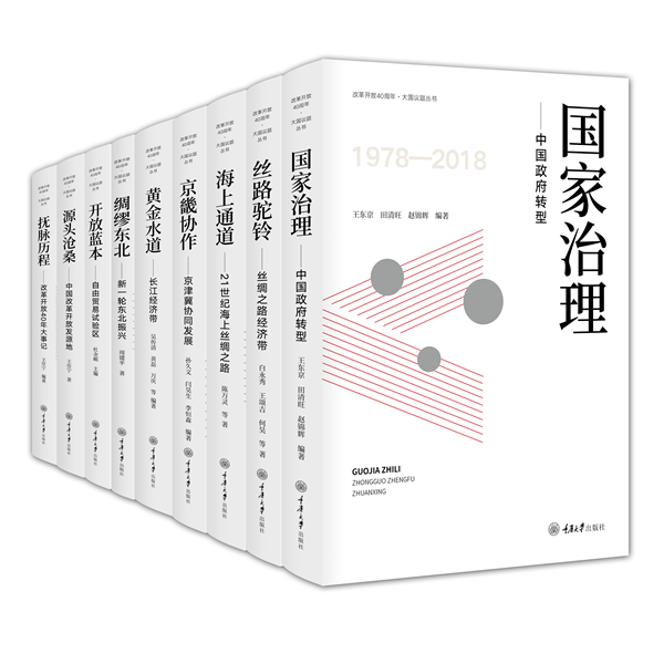 “改革开放40周年·大国议题丛书”以习近平新时代中国特色社会主义思想为指导,选题聚焦党的十八大以来以习近平同志为核心的党中央治国理政的伟大实践,由中央党校(国家行政学院)副校(院)长王东京教授、重庆大学校长张宗益教授担任丛书编委会主任,作者来自中央党校、国家发展改革委、中国人民大学、yl7703永利集团等单位。该丛书先后入选重庆市出版专项资金资助项目(2017年)、教育部全国高校出版社主题出版项目(2018年)、国家出版基金资助项目(2019),于2018年底正式出版发行。丛书分为9卷,共300万字,各卷分别为《国家治理——中国政府转型》《丝路驼铃——丝绸之路经济带》《海上通道——21世纪海上丝绸之路》《京畿协作——京津冀协同发展》《黄金水道——长江经济带》《绸缪东北——新一轮东北振兴》《开放蓝本——自由贸易试验区》《源头沧桑——中国改革开放发源地》和《抚脉历程——改革开放40年大事记》。其中,《丝路驼铃——丝绸之路经济带》由白永秀教授领衔撰写,该书分八章研究丝绸之路经济带建设中的理论与实践问题,兼具理论系统性和可读性。