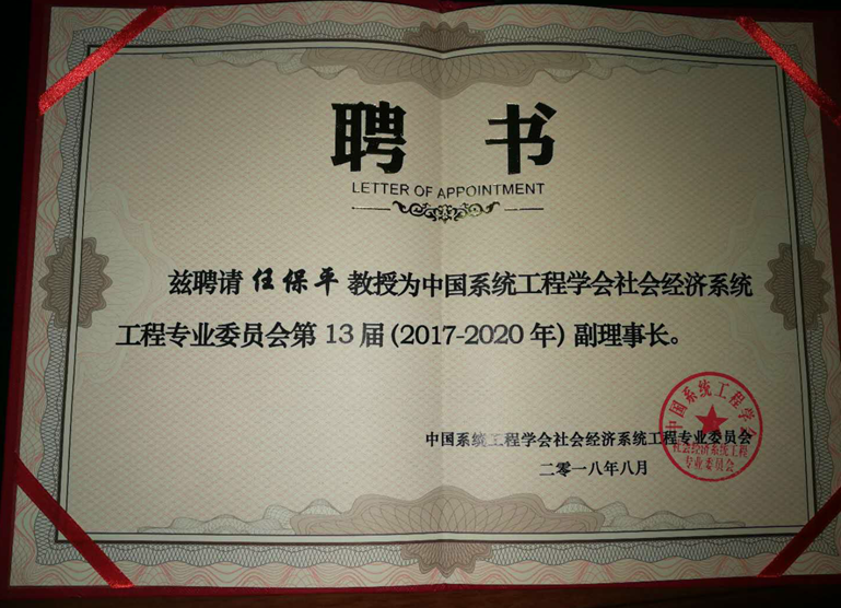 会议结束后,经过学会研究,聘任任保平教授为中国系统工程学会社会经济系统工程专业委员会副理事长,并邮来了学会的聘书。