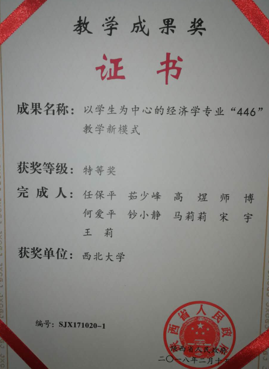 2018年3月14日上午,陕西省教育厅举行2017年度陕西省教学成果奖颁奖仪式,我院任保平教授应邀参加。任保平教授主持的《以学生为中心的经济学专业“446”教学新模式》获特等奖。该成果是以任保平教授为首的教学团队多年来奉献教学、研究教学,坚持教学与科研并重的集中体现。