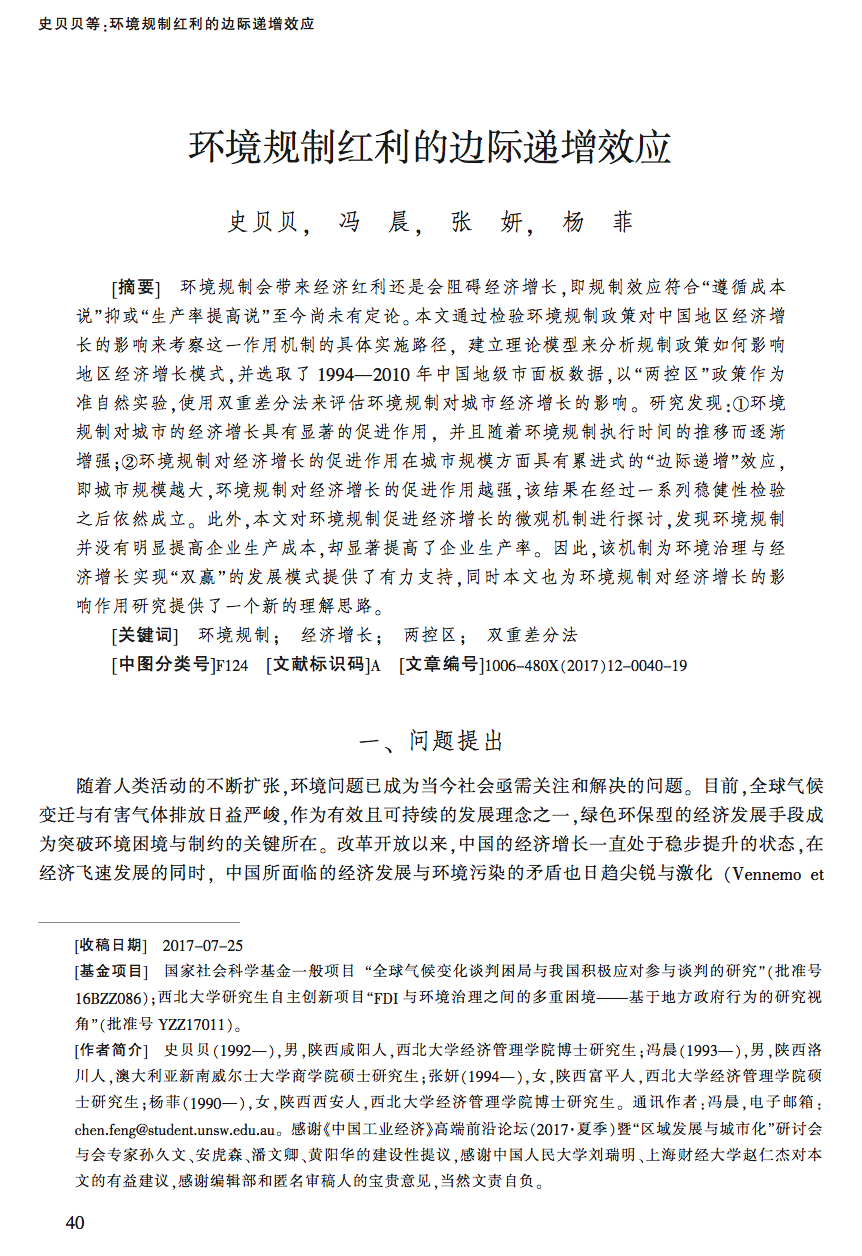 近日,我院博士研究生史贝贝、杨菲,硕士研究生张妍以及我院2015届本科毕业生冯晨的合作文章在权威期刊《中国工业经济》2017年第12期发表,全文2万字,探讨了环境规制与经济增长的影响关系与机制。