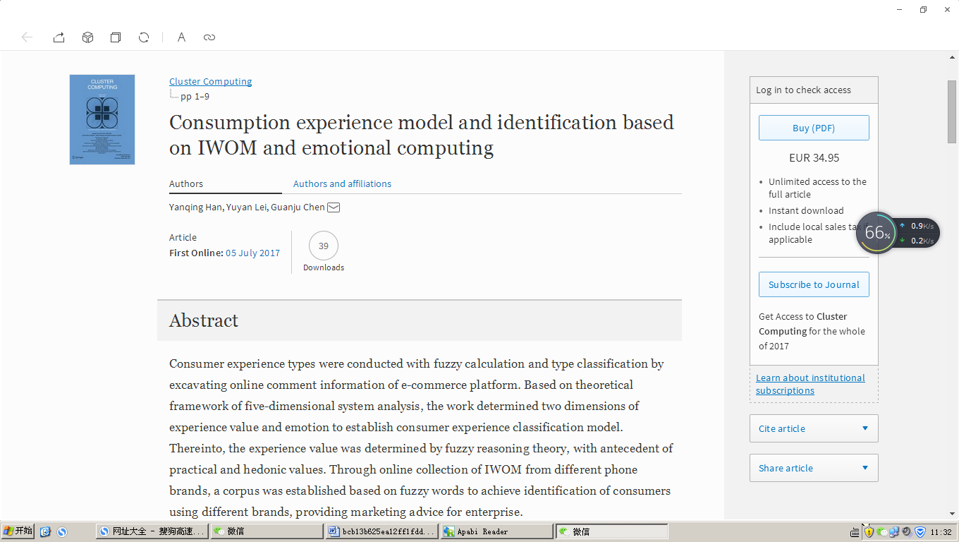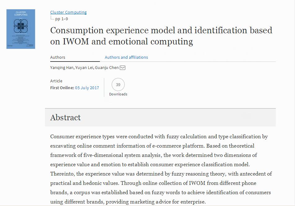近日,我院博士生韩延庆、雷雨嫣与陈关聚教授在SCI检索期刊《cluster computing》(ISSN: 1386-7857 (Print) 1573-7543 (Online))上在线发表论文《Consumption experience model and identification based on IWOM and emotional computing》。论文链接:https://link.springer.com/article/10.1007/s10586-017-1017-y。《cluster computing》期刊的影响因子(Impact Factor)为2.04。