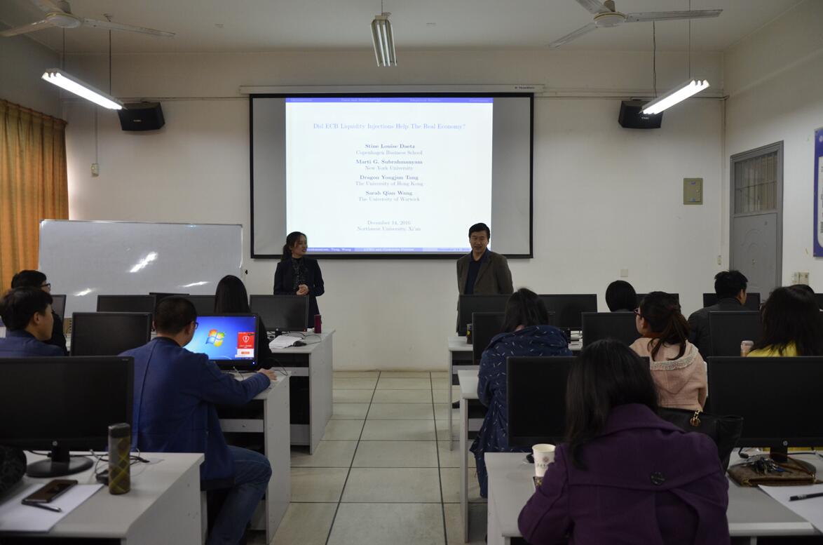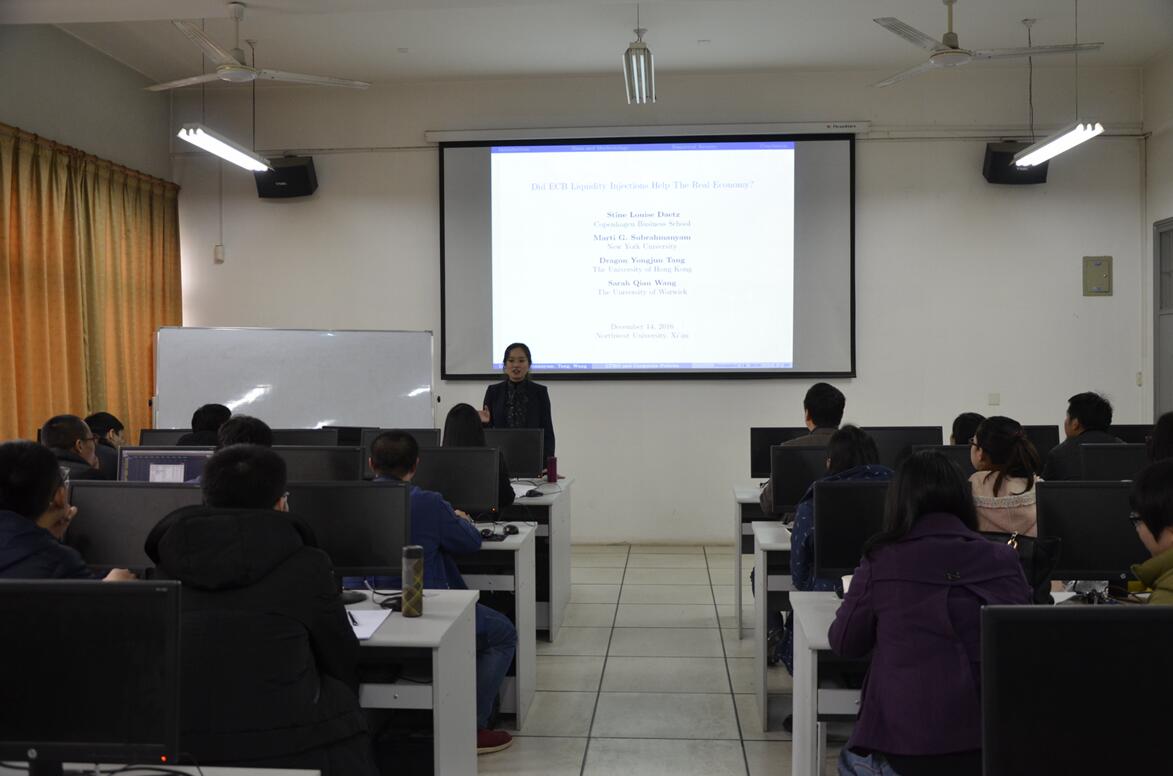经济类教师学术沙龙2016年第4期(总第82期)于2016年12月14日下午在yl7703永利集团长安校区8110教室举行。任教于英国华威大学的王倩博士应邀以《欧洲央行的流动性注入如何影响实体经济》为题,向参加活动的学院师生作了报告。本次沙龙由金融系副主任王峰虎副教授主持,金融系俞颖副教授点评,多名青年教师及我院部分硕士研究生参加了本次沙龙。