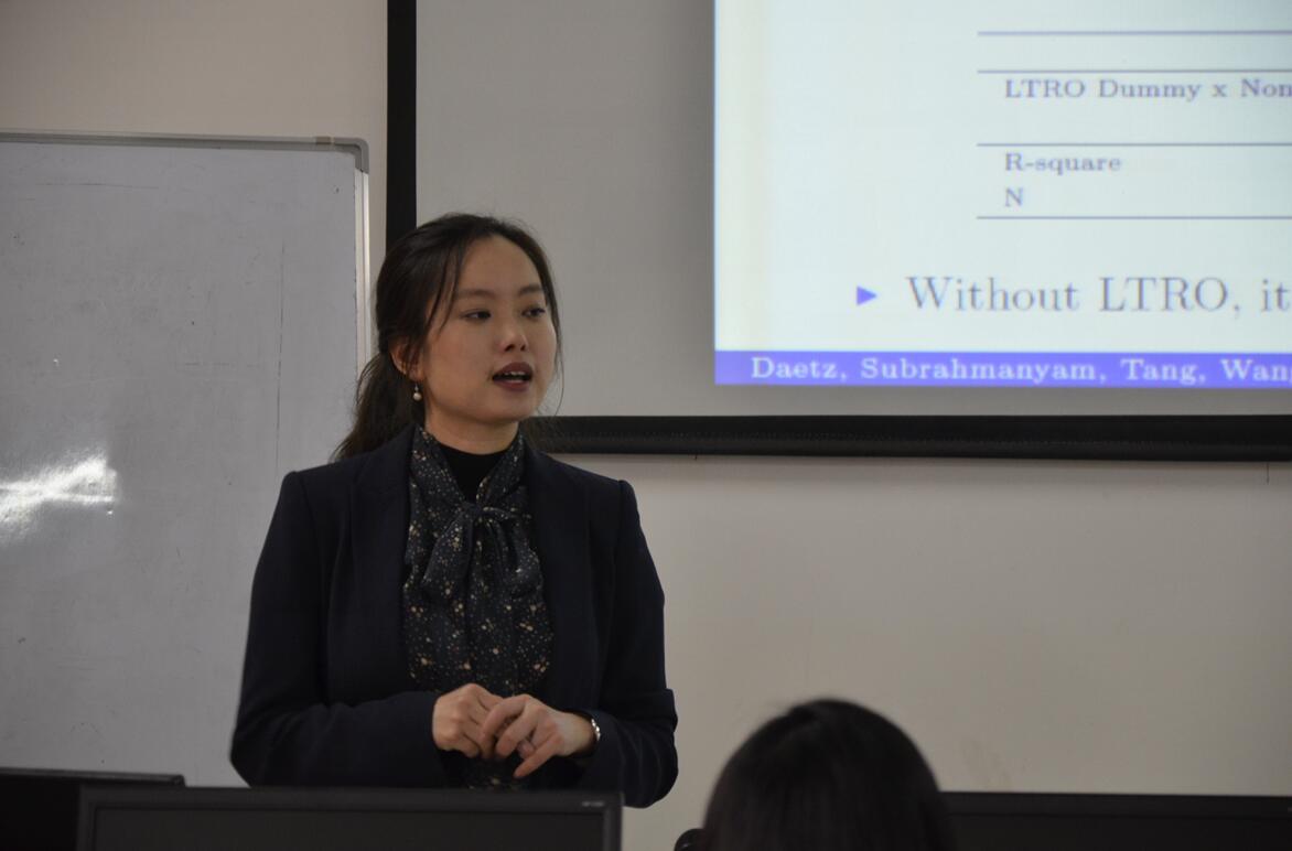 王倩博士2006年本科毕业于我院金融学专业,现为英国华威大学金融学助理教授,目前已在国际一流金融学期刊发表研究成果,包括Journal of Financial Economics、Review of Financial Studies等,并多次在国际学术会议上获得最佳论文奖,获得包括中国经济学优秀博士论文奖,香港大学优秀毕业生等荣誉。在本次报告中,王倩助教授汇报了她最新的研究成果,核心探讨“货币政策的也有效性问题”,运用详实的欧洲跨国的微观企业数据,深入探讨检验了欧洲央行的多轮长期再融资计划对于企业投资的影响。结果发现欧洲央行的宽松货币政策,并没有取得促进企业加大投资和提高雇佣的预期效果。最后,王倩助教授与参加沙龙的教师、同学就本文的主题以及她在海外的求学经历展开了充分交流。
