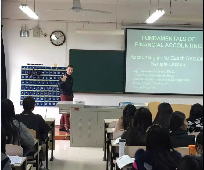 访学期间,Jaroslav Kovárník副教授为2015级会计学专业和2015级经济统计学专业学生讲授了关于“存货(Inventory)”的会计准则,深入解读了“Periodic Inventory System”和“Perpetual Inventory System”两种存货核算方法。通过学习,学生进一步理解了中国与捷克在存货核算方面的异同,并加深了对会计准则国际趋同的认识。Jaroslav Kovárník副教授还为2015级会计学专业学生做了题为“捷克会计专业学生培养”(Accounting in the Czech Republic Sample Lesson)和“捷克会计准则及会计报表实践”(Accounting Principles and Financial Statements in Czech)两场学术报告。在学术报告中,他详细介绍了捷克会计学实务与学术研究的发展现状与目前关注的主要问题,对捷克的利润表(Income Statement)、资产负债表(Balance Sheet)、现金流量表(Statement of Cash Flows)和股东权益变动表(Statement of Stockholders,Equity)等四大报表体系进行了详细解读,并将其与我国目前的会计信息披露体系和模式做了进一步对比分析。