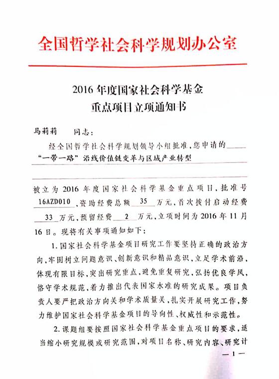 近日,经全国哲学社会科学规划领导小组批准,我院马莉莉教授主持申报课题《“一带一路”沿线价值链变革与区域产业转型》获批立为2016年度国家社会科学基金重点项目。