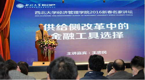 王忠民教授做了题为《供给侧改革中金融工具选择》主题演讲,他向在座师生表达了重回母校的愉悦心情。他在演讲中指出,当前引起热烈讨论的以“去产能、去库存、去杠杆、降成本、补短板”为主要内容的供给侧改革,为中国经济今后的发展指出了很好的方向,但在路径与工具的选择和运用有待进一步探讨。他从市场逻辑、创新逻辑和信用逻辑等角度,深入剖析了降低社保、土地成本居高不下、加大货币发行量、债转股等热点问题。
