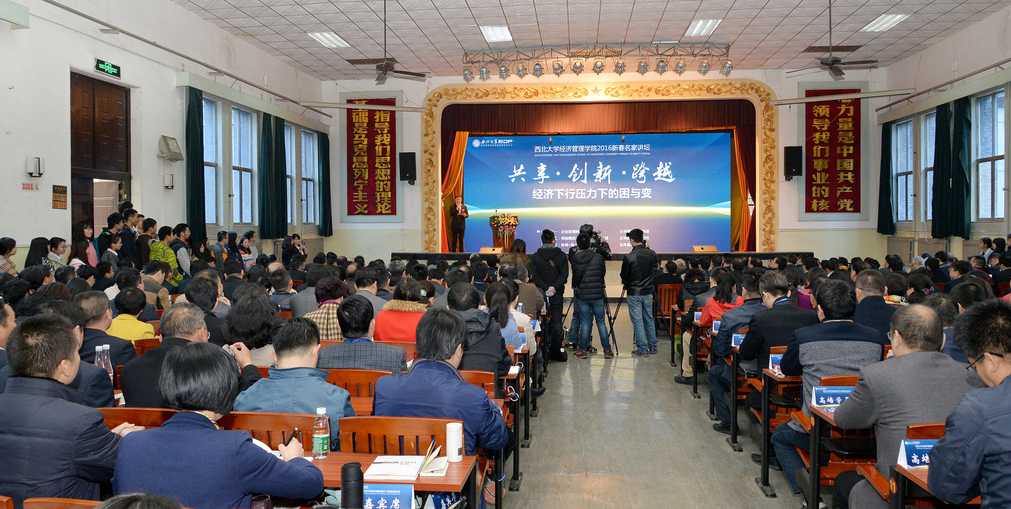 3月25日,由经管学院和陕西省宏观经济研究院举办、经管学院高级管理培训中心承办的“2016新春名家讲坛”在太白校区大礼堂成功举行。本次讲坛以“共享·创新·跨越——经济下行压力下的困与变”为主题,邀请杰出校友、著名经济学家张维迎,全国社保基金副理事长、我校前校长王忠民,致远软件营销副总裁、协同研究院院长刘古权和经管学院院长、陕西省宏观经济研究院执行院长任保平在讲坛上围绕“企业家精神”、“供给侧改革”和“协同共享发展”作了演讲。校长郭立宏在活动中讲话,党委副书记、副校长、博士生导师贾明德主持了讲坛。陕西省发改委副主任刘迎军和发改委相关部门负责人出席了讲坛,经管学院和校内其他院系600余人聆听了讲座。