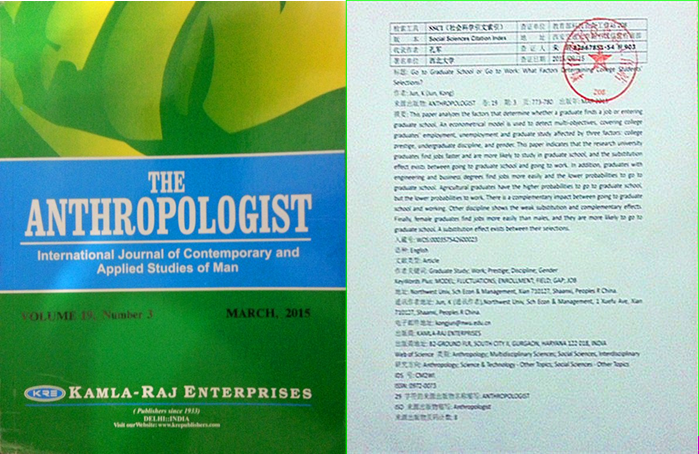 近日,我院孔军副教授的论文《Go to Graduate School or Go to Work: What Factors Determining College Students’ Selections?》在SSCI检索期刊The Anthropologist上发表(Vol.19(3), pp.773-780)。The Anthropologist《人类学家》是国际跨学科的应用社会科学综合期刊。