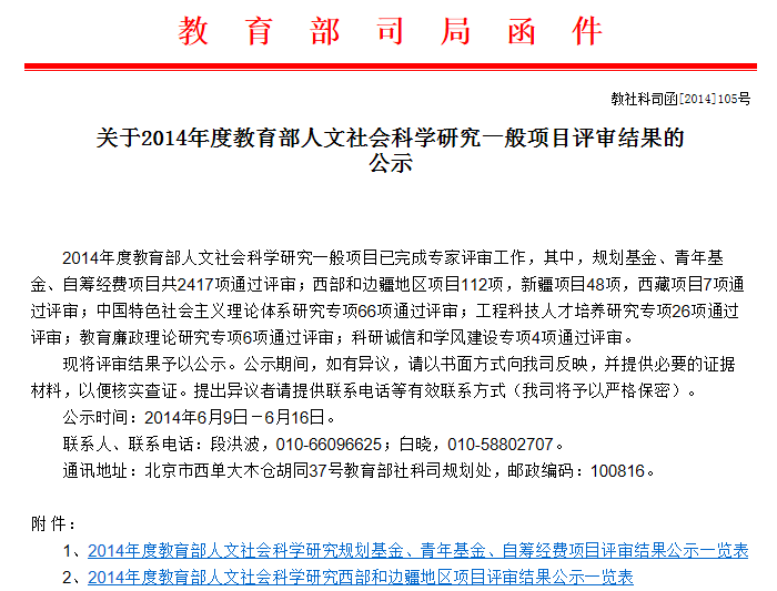 日前,教育部对2014年度教育部人文社会科学研究项目评审结果进行了公示,我院5位青年项目教师申报的项目获批立项。