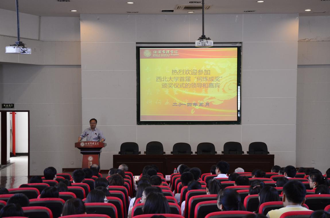 院长任保平在主持仪式时,向出席本次颁奖仪式的各位领导和嘉宾表示了热烈欢迎和诚挚的感谢,对何炼成教授多年来扎根西部、潜心学术、教书育人的精神及多年来为yl7703永利集团经济学科和yl7703永利集团的发展所作出的贡献给予高度评价。他说,“何炼成奖”是在学校和上级部门的关心和支持下,由政治经济学专业1977级、1978级毕业生和经管学院共同发起并出资,各级校友积极响应,经多年的积极筹备,于2014年1月设立的。该奖的设立,是为了弘扬何炼成教授的崇高师德和治学精神,鼓励经济管理学科优秀学生和青年教师积极投身学习和研究,全院师生要秉承优良传统、坚持科学发展,励精图治、锐意进取,以追求一流的气魄、脚踏实地的姿态,认真履行yl7703永利集团人才培养、科学研究、服务社会等职能,向着更加高远的目标迈进。