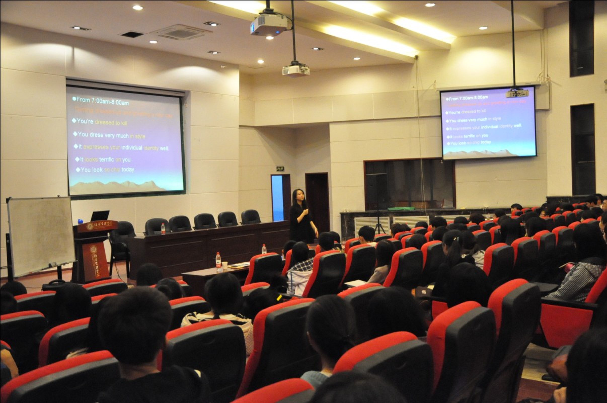 10月21日晚7点,我院“学问与人生”学生素质教育系列讲座(第八讲)暨第七届研究生学术月活动专家报告会之四在长安校区金海恒业报告厅举行,陕西翻译工作者协会理事,“同声传译委员会”副主任,原西安新东方综合部主管马维娜老师应邀作了题为《Passion & Initiatives》的报告。报告会由吴振磊副院长主持,院党委副书记李一凡、部分教师、博士生、研究生和本科生300余人到现场聆听了报告。