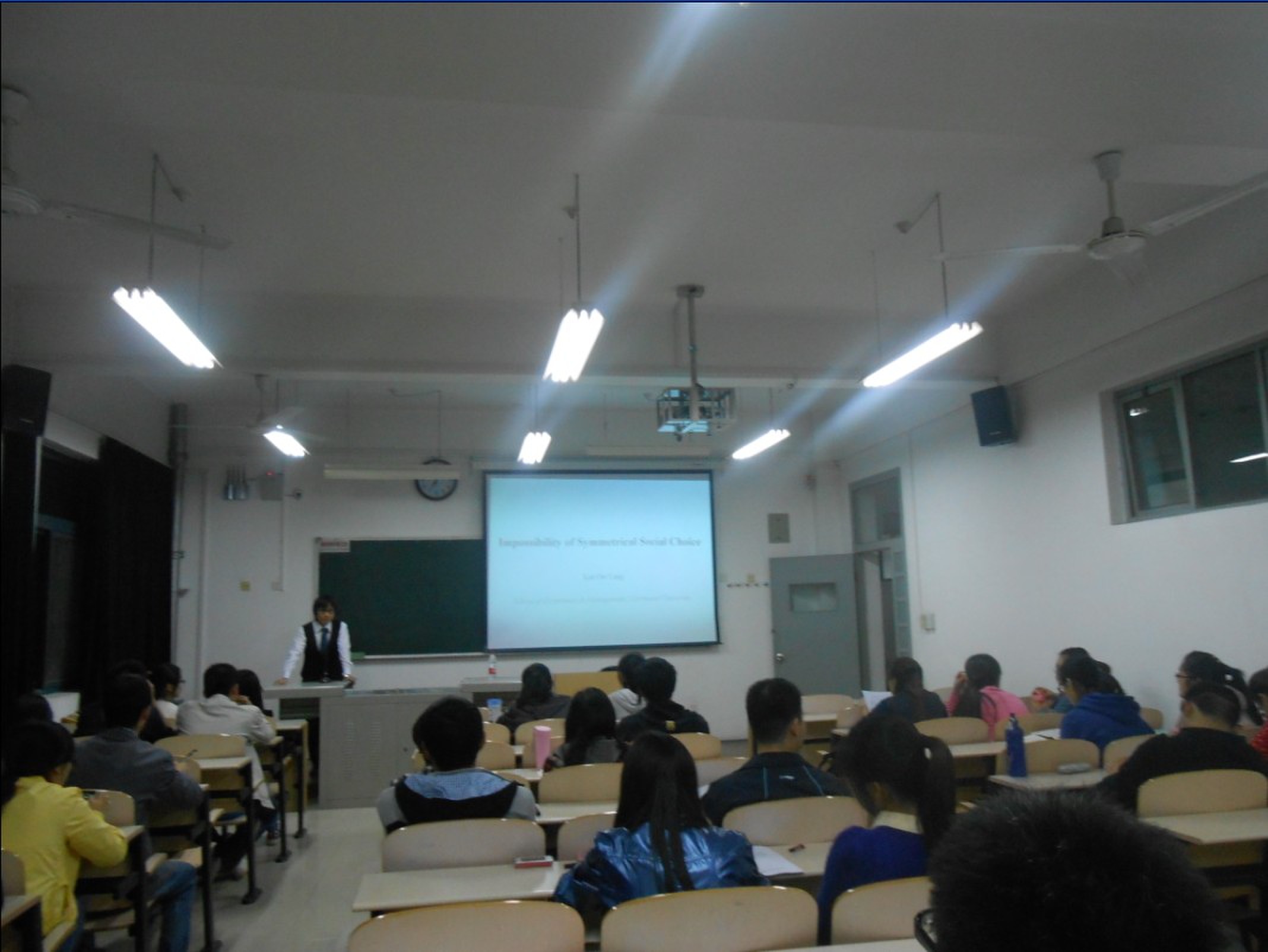 10月15日晚上7点,我院“经曰管云”系列学术论坛第二十一讲暨第七届研究生学术活动月学术讲座第五场在1309教室举行。我院数理经济与统计学系讲师欧阳葵老师作了题为《Impossibility of symmetrical social choice》的学术报告。我院80余研究生参加了此次报告会。