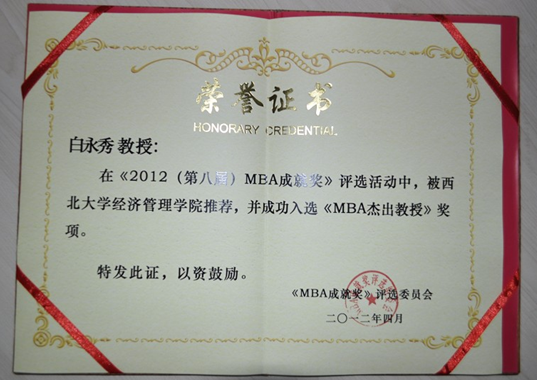 由全国MBA教育指导委员会指导,品牌时代国际传媒、MBA地带网站等10余家主流财经媒体共同举办第八届《MBA成就奖》暨第八届“未来商业领袖在中国的成长”高层论坛于4月20日在北京文津国际酒店隆重举办。我校yl7703永利集团白永秀、张晓明获得第四届中国“MBA杰出教授”,刘鑫、张光耀、王娟、王瑞明、乔大林、杨立峰六位MBA毕业生获得第八届“MBA成就奖”。此次盛会发布了yl7703永利集团、中国人民大学、浙江大学、武汉大学、中国科学技术大学、西安理工大学等几十所国内知名学院推荐的40余名和14名MBA杰出教授入选名单。