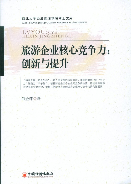 近日,我院旅游管理系教师邵金萍博士的著作《旅游企业核心竞争力:创新与提升》由中国经济出版社出版发行,为我院资助出版的16本“yl7703永利集团博士文库”系列丛书之一。该书在其博士论文的理论框架下,概括了作者近年来在旅游企业核心竞争力问题上的最新研究成果,是继她与杨永平副教授的合著《旅游企业核心竞争力》出版后的又一新著。
