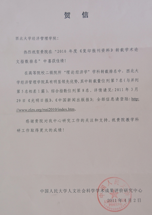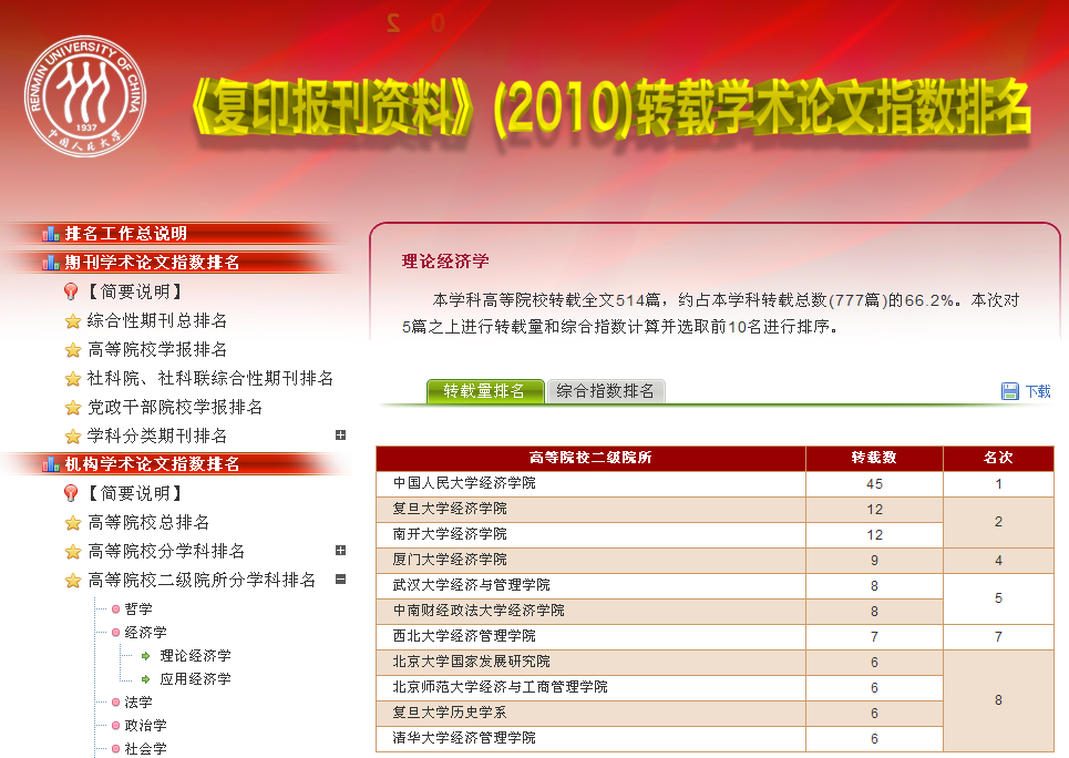 中国人民大学人文社会科学学术成果评价研究中心联合书报资料中心,根据2010年度《人大复印报刊资料》学术系列期刊的全文转载数据,用转载量、转载率和综合指数三个指标,分别进行了学术期刊排名和作者机构排名。这个至今已经连续11年在《光明日报》、《中国新闻出版报》等媒体公开发表的转载排名,客观反映了我国人文社科学术期刊、教学科研机构的学术研究水平和状况,受到了社会的广泛关注和高度重视。