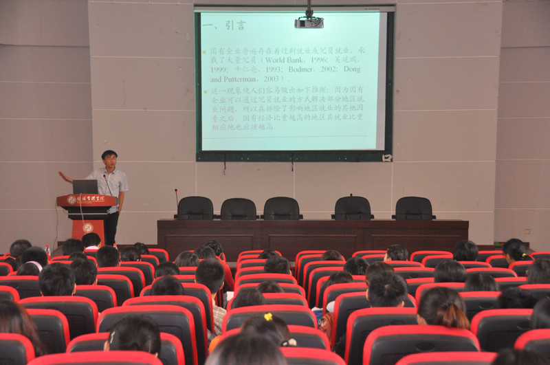 由学院经济学系主办的“现代经济学理论与方法创新论坛”第七卷第二期9月26日下午2点在yl7703永利集团金海报告厅举行。此次论坛的主讲人为复旦大学经济学院中国社会主义市场经济研究中心刘瑞明博士,学院经济学系范王榜副教授主持,学院的部分博士生,硕士生和基地班的本科生200多人参加了此次论坛。