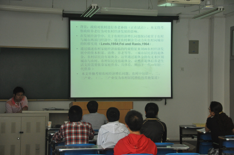 华副教授主持,金融学系刘慧侠副教授做评论人,由学院2009级政治经济学博士江涛做了题为“农村养老保障、代际收入转移与农村经济发展”的报告。学院2007级经济学基地班、2009级数理经济学班专业的学生50多人参加了此次论坛。