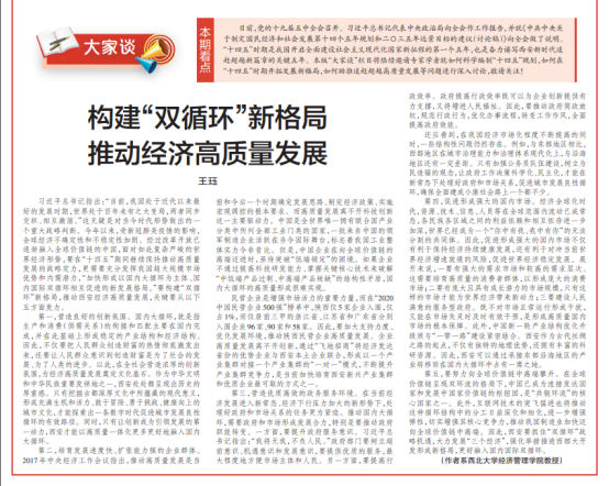 近日,《西安日报》(2020年11月2日)理论与实践版面刊发我院王珏教授题为“构建‘双循环’新格局,推动经济高质量发展”的文章。