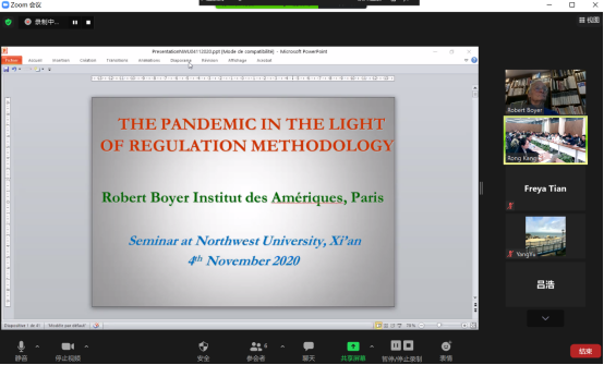 Robert Boyer 教授的讲座题为“the Pandemic in the Light of Regulation Methodology”,他从危机的产生经过、对经济与人民生活的影响等方面对比了历史上的一系列危机(1929年、1973年、2000年、2008年),指出虽然此次新冠疫情的爆发使得国民经济急剧下滑,破坏程度非2008年经济危机所能及,然而其对于经济、政治、社会、卫生领域的剧烈影响并非没有先例,且影响程度具有国家差异。同时,Robert Boyer 教授着重分析了健康与经济方面的不确定信息是如何相互作用于经济和金融领域,并且在公共卫生、国家经济和公民权利方面造成三重困境的。他提出以健康、教育和文化为中心的新型发展模式,并解释了其背后的逻辑。在疫情对宏观经济调控形成突然冲击的情况下,以电商和远程工作为特征的数字资本主义展现出前所未有的生命力;美国、中国和欧盟呈现了平台经济的三种模式。他强调在后疫情时代是否可以形成有利于“人本发展”理念的政治联盟值得思考,重新将经济融入社会和政治环境中并非单纯的技术问题。