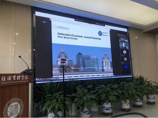 Bruce Cronin教授的讲座题为“Heterodox economic Journal ranking”,他对非主流经济学和主流经济学作为经济学学科中的两大竞争性范式进行了对比,动态展现了非主流经济学在当前学术环境中发展受限的局面,尤其表现在期刊的出版与评估方面。此外,教授介绍了包括JRQS、JNQS、TCS、JPEQS在内的多种非主流经济学期刊质量评估指标,并比较了各类指标的优势和局限性。本场讲座由学院王珏教授主持,她对Bruce Cronin教授做了简要介绍,并指出非主流经济学期刊的质量评估是一个较为新颖且值得进一步探究的领域,这对师生今后的论文发表具有重要的借鉴意义。