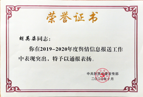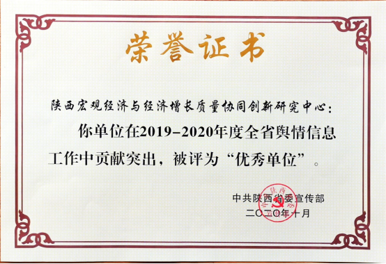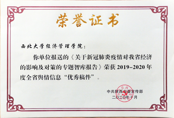 日前,省委宣传部对2019-2020年全省舆情信息工作进行了表彰,我院和陕西宏观经济与经济增长质量协同创新研究中心被评为“优秀单位”,我院2018级金融学硕士研究生胡英姿被评为“优秀个人”,我院报送的《关于新冠肺炎疫情对我省经济的影响及对策的专题智库报告》获评“优秀稿件”。