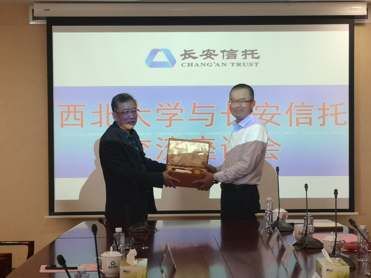 最后,王满仓教授总结到,高校的人才培养应当与用人单位的需求相匹配,培养能够适应市场需求的复合型人才。近年来,学院的学科建设不断取得进步,金融学也在2020年获评了国家一流学科,希望今后加强与企业的深度合作,邀请企业精英来学院做讲座,担任专硕导师,拉近学校与企业的距离,提高学院人才培养质量。座谈结束后,王满仓教授代表学院向长安信托赠送纪念品。