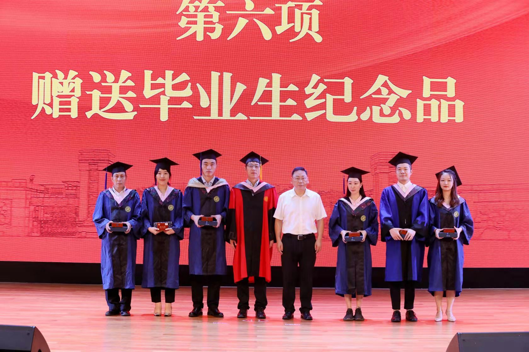 仪式上,温睿宣读了学位授予决定。郭立宏、吴振磊逐一为MBA/EMBA毕业生拨穗正冠、颁发证书并合影留念。温睿、杜勇向毕业生代表赠送毕业纪念品。