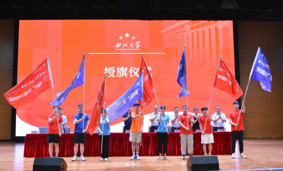 暑期社会实践团队带队指导教师数理经济与统计学系宋文月老师在发言中介绍了社会实践对学生成长成才的重要意义。她表示,作为带队指导老师一定会担负起责任和使命,守住安全底线,并结合自身专业知识,做好指导和帮助工作,保障社会实践活动高质量完成。随后,与会领导为2021年暑期实践校级重点立项团队代表授旗。