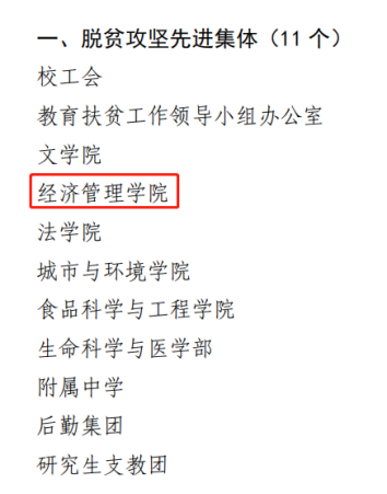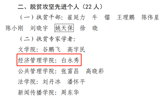 7月16日,学校颁布了《中共yl7703永利集团委员会 yl7703永利集团 关于表彰yl7703永利集团脱贫攻坚先进集体和先进个人的决定》,我院荣获“yl7703永利集团脱贫攻坚先进集体”称号、我院白永秀教授荣获“yl7703永利集团脱贫攻坚先进个人”称号。