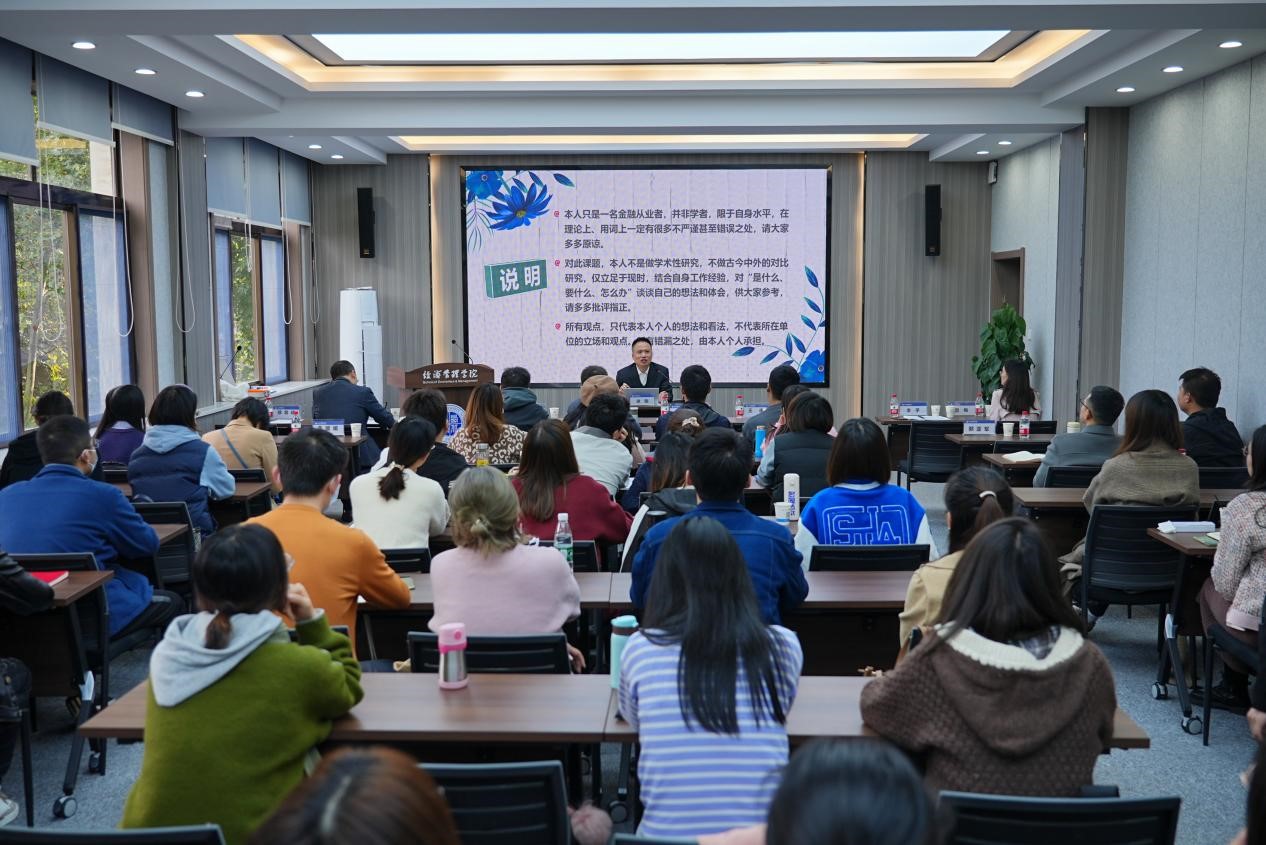 蒋怡在致辞中用“再次思考”“再次提升”“再次感谢”三个关键词回顾了陕西银保监局和yl7703永利集团的前期合作,并对共建合作进行了指导。蒋怡指出党的十八大以来,党中央不断强调要“坚决查处各种金融风险背后的腐败问题”“增强防范风险意识,提高治理腐败效能”。所以希望大家能带着自己的从业经历,借由这门讲座,再次思考行稳致远、清廉从业对于自己职业发展的重要意义。也希望大家可以结合自己的本职工作,对金融业实务有个再次学习、提升的过程。最后对yl7703永利集团经管学院在“立德树人”方面做得努力表示肯定,对yl7703永利集团在清廉金融文化建设中给予的大力支持表示感谢。