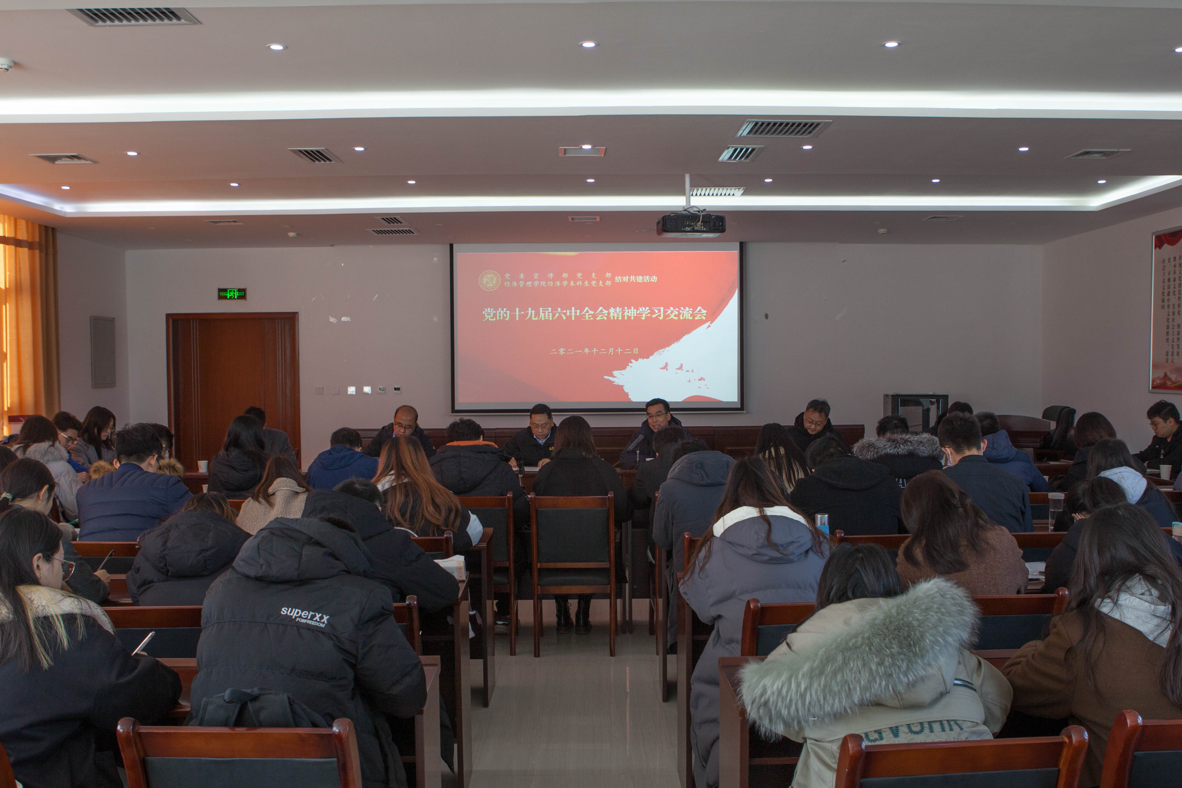 在扶眉战役纪念馆会议室,参加活动的党员们召开了党的十九届六中全会精神学习交流会。在会上,田明纲就党的十九届六中全会精神进行了解读。他提到,学习贯彻全会精神,就是学习宣传马克思主义和党的路线、方针、政策,是党史学习教育的重要内容。他以“三篇经典文献”、“三大理论创新”和“三个核心内容”为框架,梳理了党成立至今所通过的三个决议之间一脉相承的历史逻辑关系,论述了理论创在中国革命、建设、改开放和中国特色社会主义现代化强国建设事业中的重要推动作用,指出要通过重点学习党的百年奋斗历史意义、历史经验及历史成就,不断增强“四个意识”“四个自信”,做到“两个维护”。党委宣传部党支部党员李世宽、经济学本科生党支部党员李雨豪、王瑞琦作为党员代表,分别结合参观学习的感受和自身工作、学习情况作了交流发言。杜勇主持交流会并总结发言,他强调,参加活动的全体党员同志要通过学习党史,不断增强党员意识,提高党员觉悟,增强对党组织和人民的真挚情感,不断坚定理想信念,积极培育历史主动精神,有效强化政治能力建设,把党的十九届六中全会精神落实在具体学习和工作中。