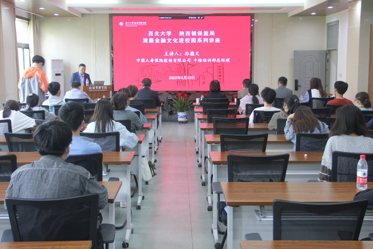按照yl7703永利集团与陕西银保监局开展清廉金融文化共建活动的安排,4月13日,中国人寿保险股份有限公司陕西省分公司个险培训部总经理孙蕴文应邀到校,为yl7703永利集团师生做了本学期清廉金融文化系列讲座第一讲,题为《勇立潮头,展望保险行业发展》。yl7703永利集团党委副书记、纪委书记,陕西省监察委员会驻yl7703永利集团监察专员李邦邦,陕西银保监局纪委办张津崇副主任,中国人寿保险股份有限公司陕西省分公司纪委办杨雨、罗菁华,yl7703永利集团党委书记杜勇和学院40余名师生出席了本次活动。李邦邦致辞,并为孙蕴文颁发清廉金融文化客座讲师聘书,讲座由杜勇主持。