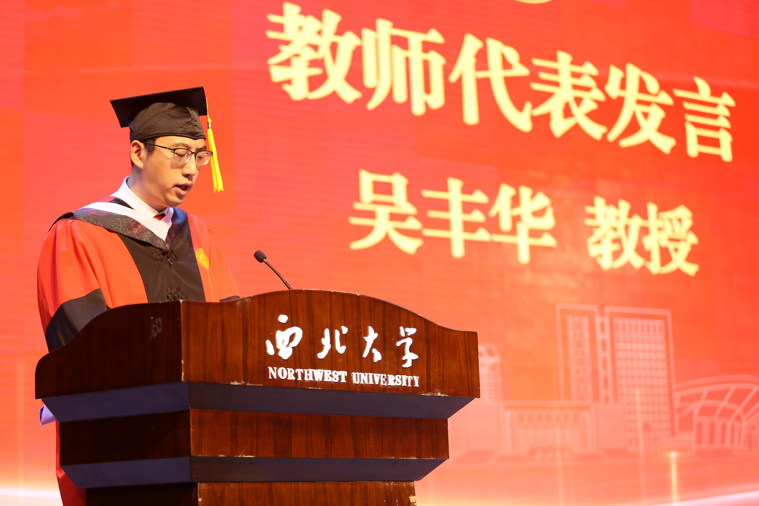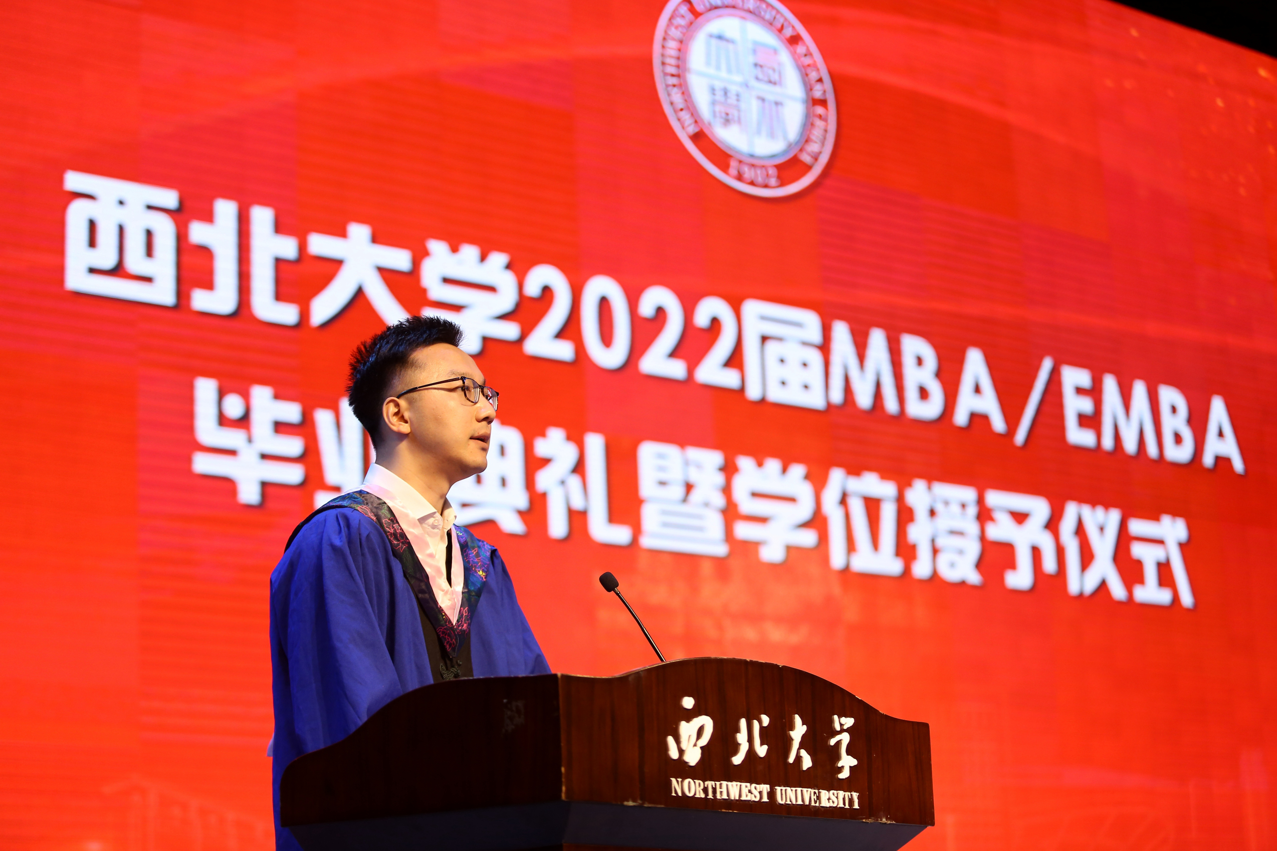 西安曲江文化产业投资有限公司企业管理部部长许启宁代表毕业生发言。他结合在校期间学习经历、切身感受和自身收获,表达了对母校的悉心培养、老师的辛勤付出的感谢和与母校即将分离的不舍与眷恋。