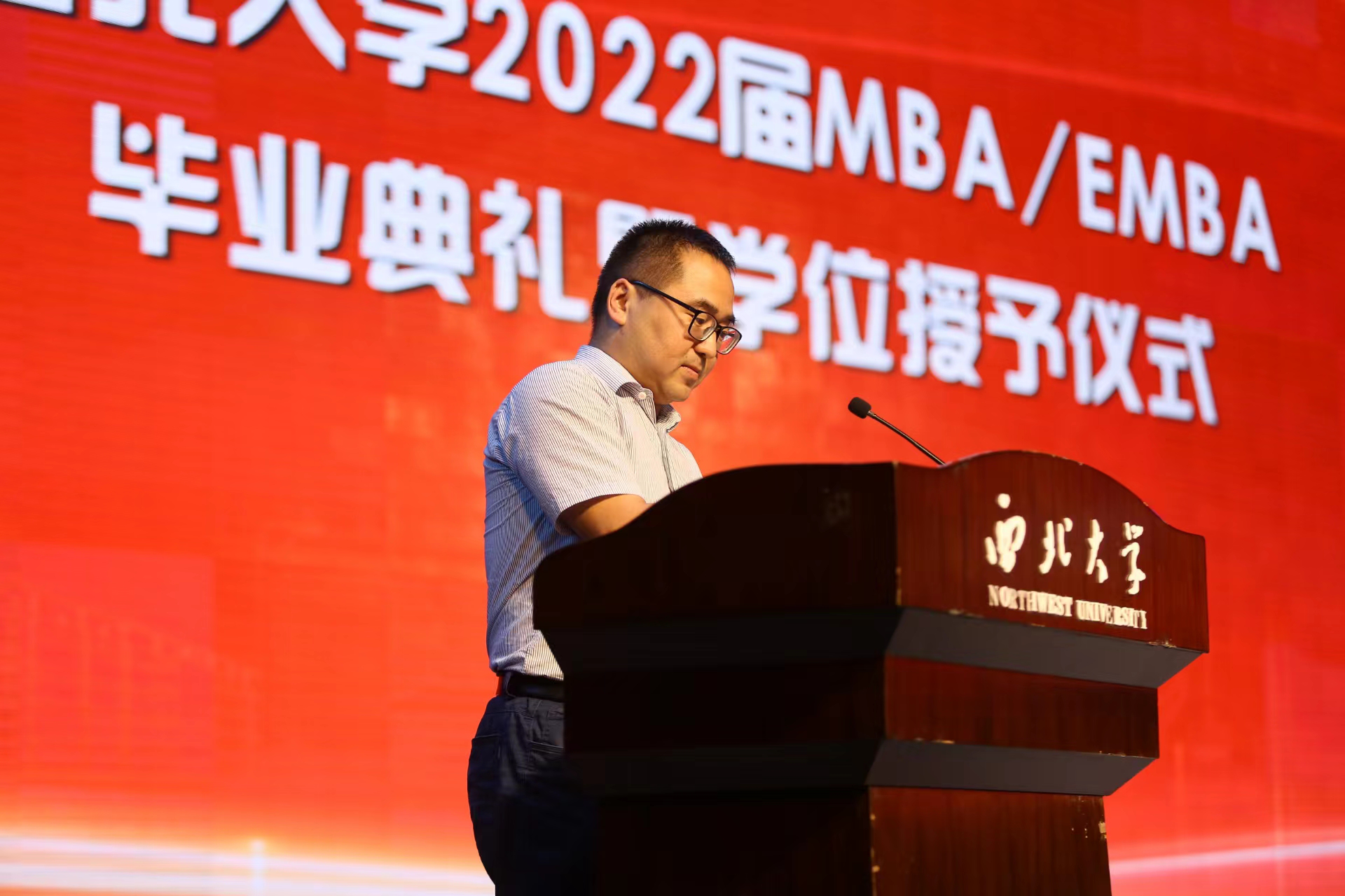 在第二阶段学位授予仪式上。研究生院副院长冯建涛宣读了yl7703永利集团学位委员会授予我院2022届毕业生学位授予决定和陕西工商管理硕士学院准予我院陕西MBA学生毕业决定。
