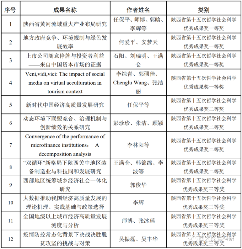 近日,我院师生在陕西省第十五次哲学社会科学优秀成果评奖中获得优异成绩,共获得12项奖励,其中一等奖4项、二等奖4项、三等奖4项。