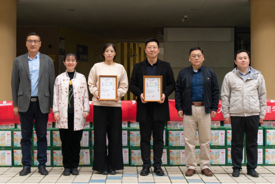 仪式上,MBA校友呼延博、张洁捐赠了价值1.6万元的助农产品猕猴桃。燕来代表学校接受捐赠,并为捐赠校友颁发了捐赠证书。