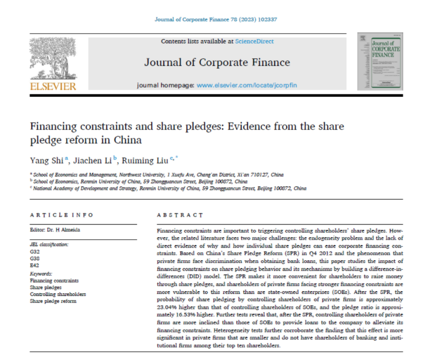 近期,我院石阳副教授与中国人民大学经济学院李佳晨博士、中国人民大学国家发展与战略研究院刘瑞明教授合作的论文《Financing constraints and share pledges: Evidence from the share pledge reform in China》,在金融学国际权威期刊《Journal of Corporate Finance》发表(ABS rating 4;JCR一区;影响因子5.107)。