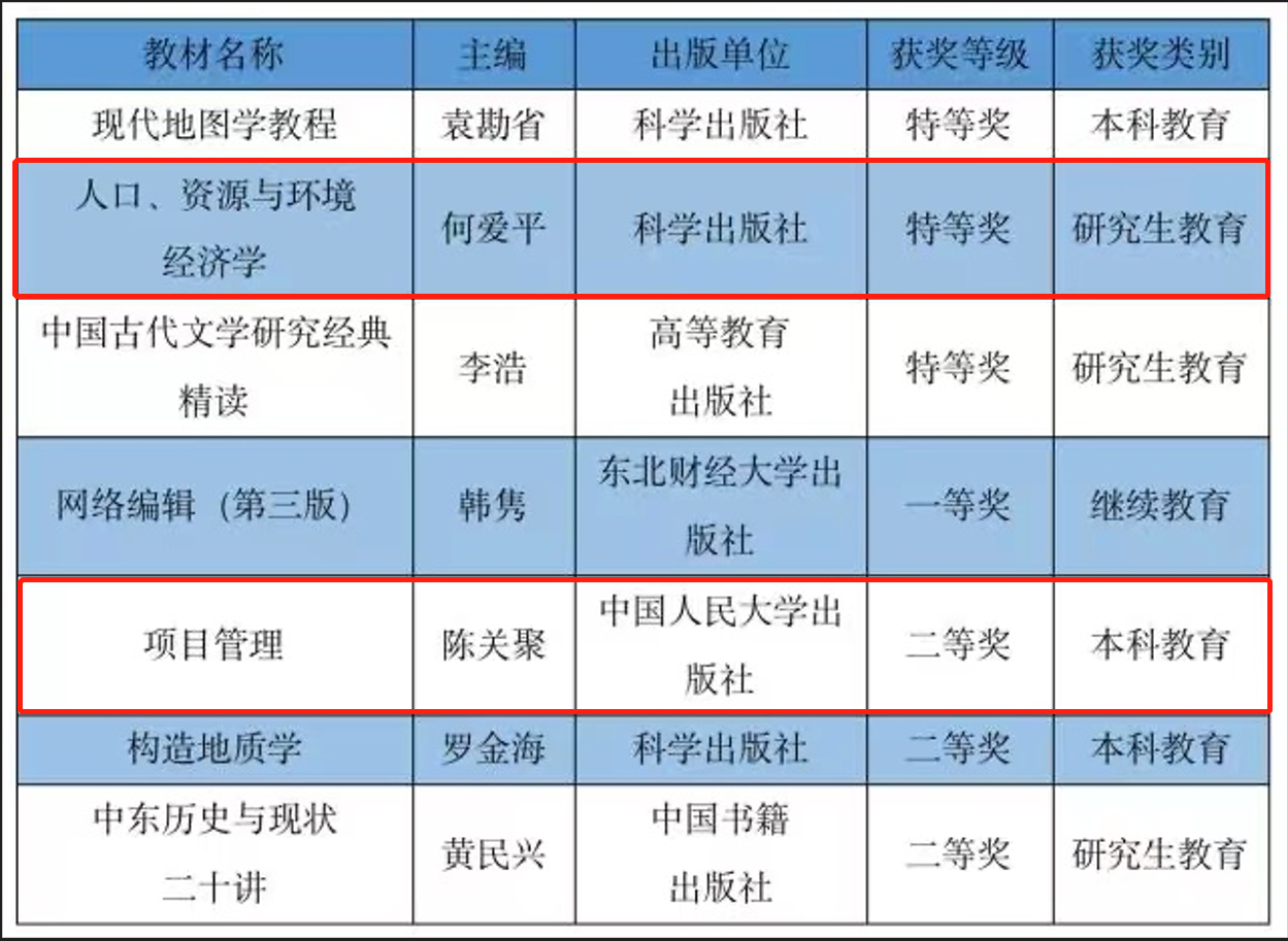 近日,陕西省2022年高等教育优秀教材奖评选结果公布,我院2部教材获奖。其中,何爱平教授主编的《人口、资源与环境经济学》荣获特等奖;陈关聚教授主编的《项目管理》荣获二等奖。