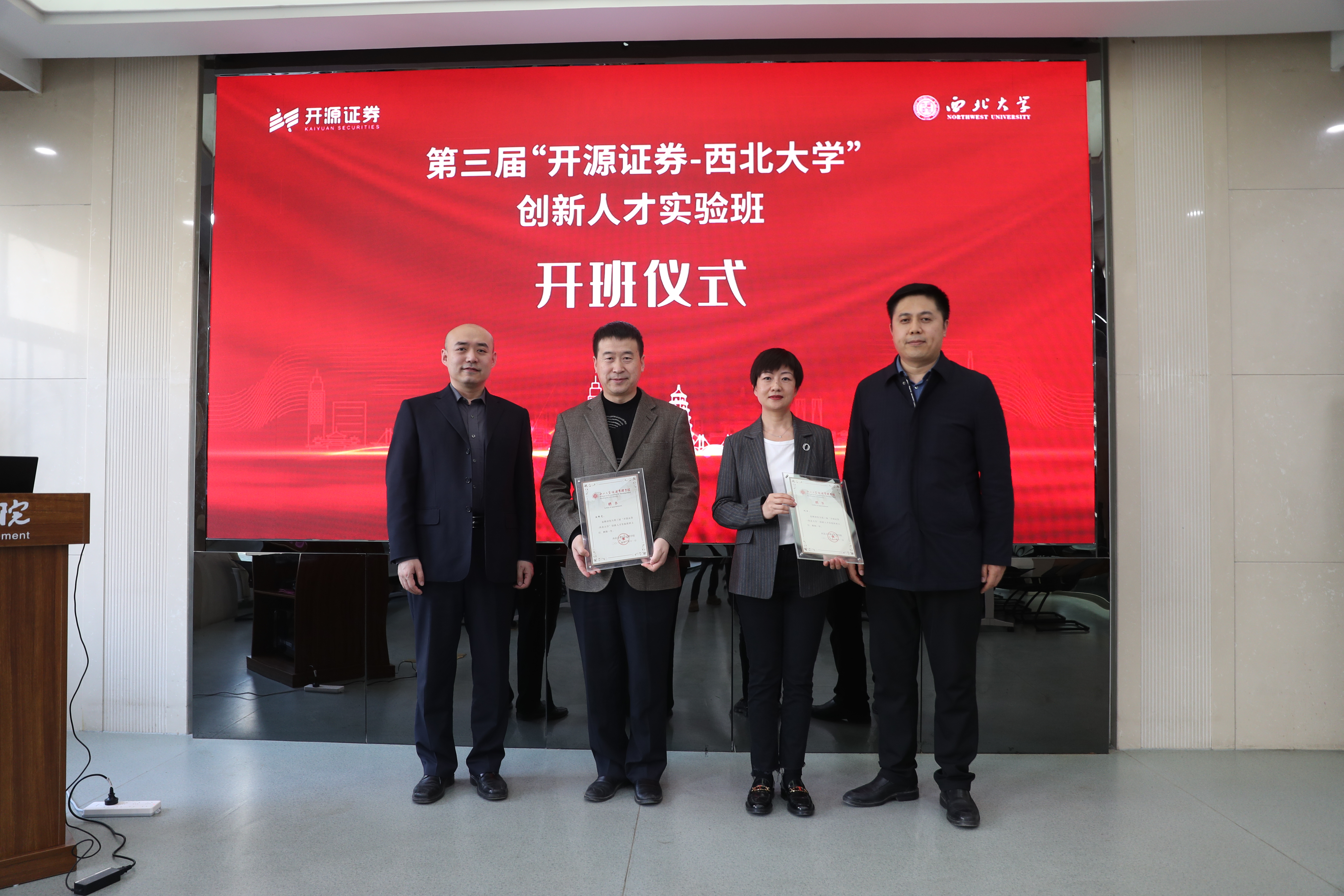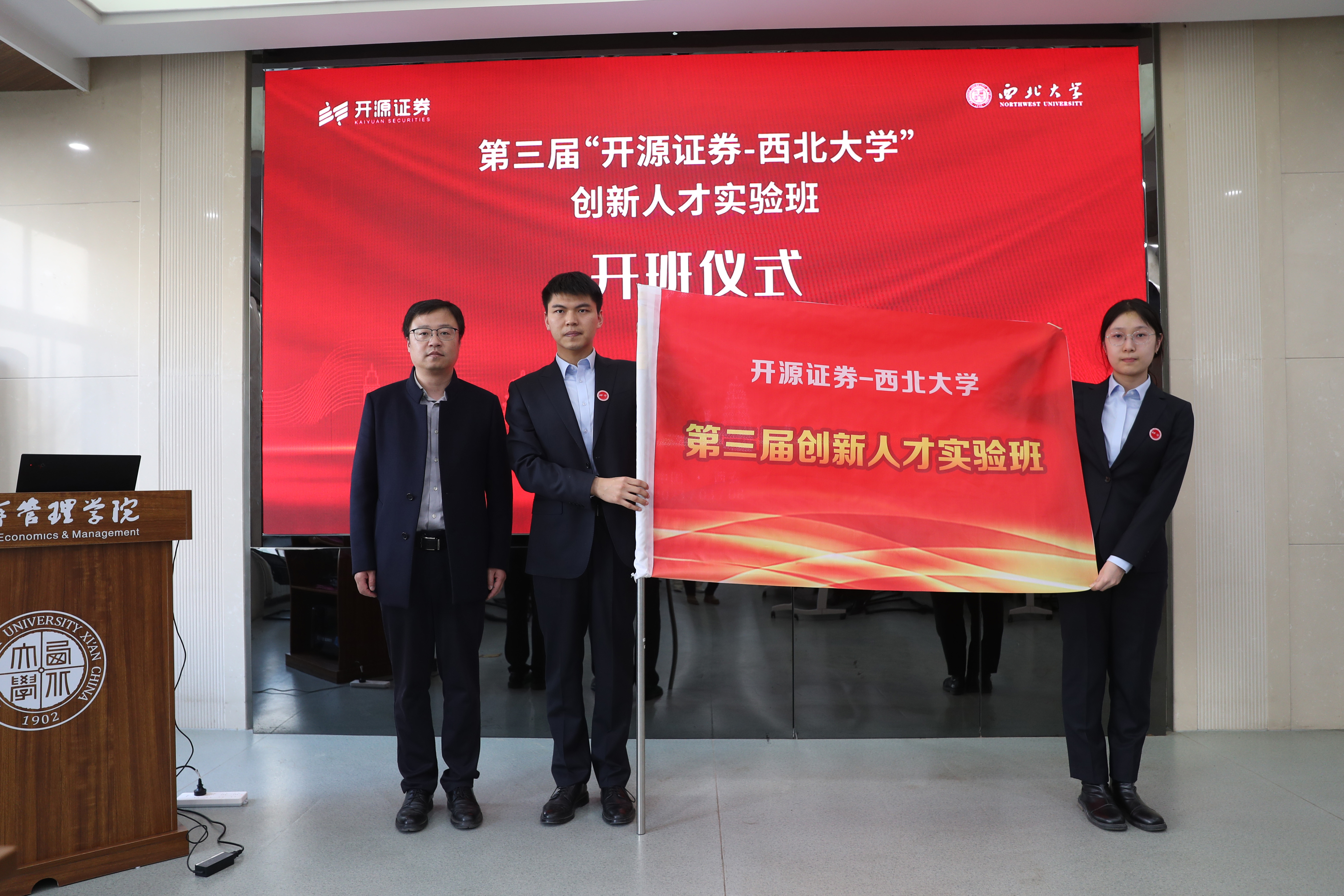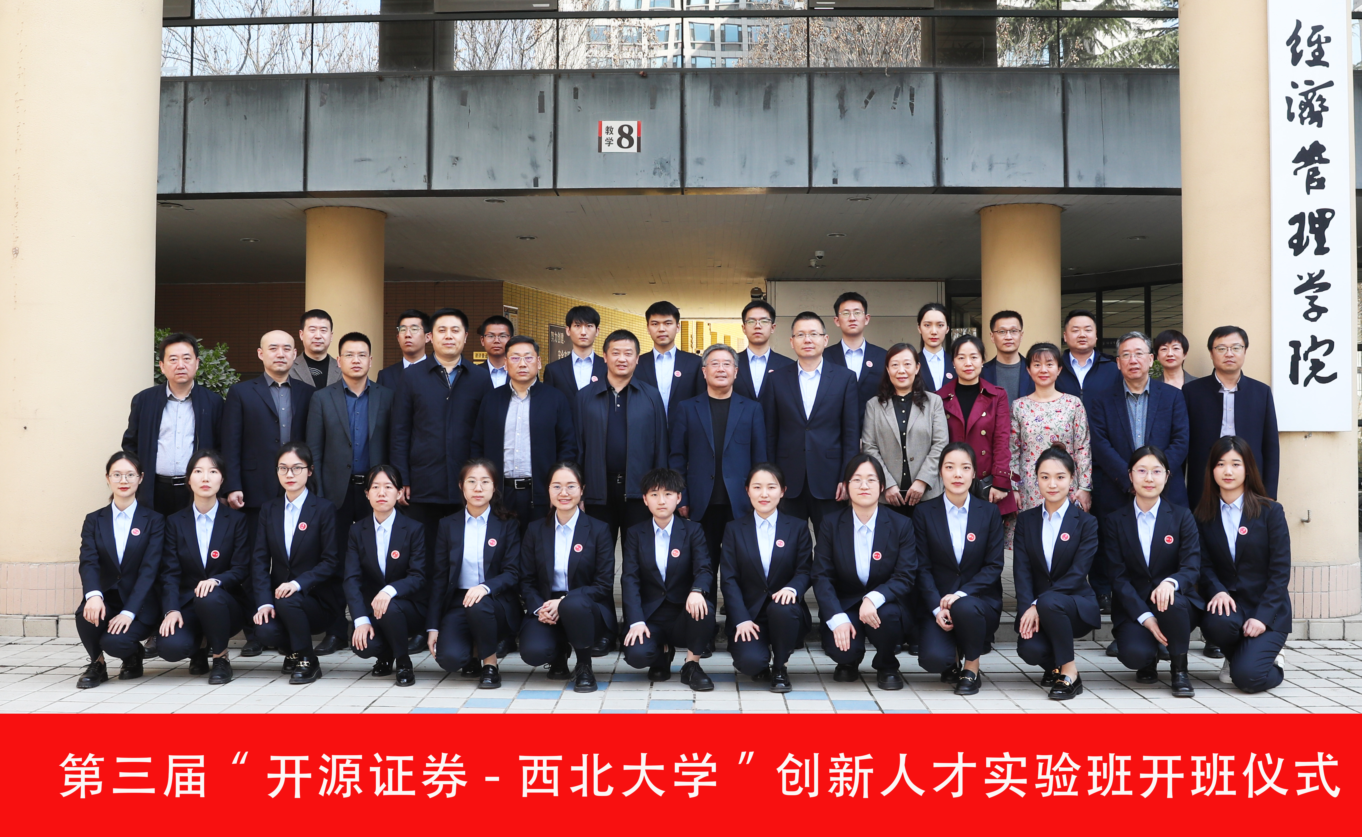 3月8日下午,第三届“开源证券-yl7703永利集团”创新人才实验班开班仪式在我院举行。第三届实验班全体学员,开源证券董事长李刚、总经理助理张国松、李青,招商银行西安分行副行长李凯,我校校长郭立宏,教务处处长曹蓉、国内合作与校友工作处处长崔延力、学生工作部副部长赵金哲、研究生院副院长寇楠、学院院长马莉莉及学院班子成员共40余人参加了开班仪式。仪式由学院党委书记杜勇主持。