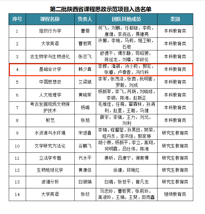 近日,陕西省教育厅公布第二批陕西省课程思政示范课程、教学团队和教学研究示范中心认定结果,我院会计学系韩少真副教授负责的《基础会计学》课程入选省级课程思政示范课程和教学团队。截至目前,学院已获批《世界经济研究》《中国特色社会主义政治经济学》《基础会计学》3门省级课程思政示范课程和教学团队。