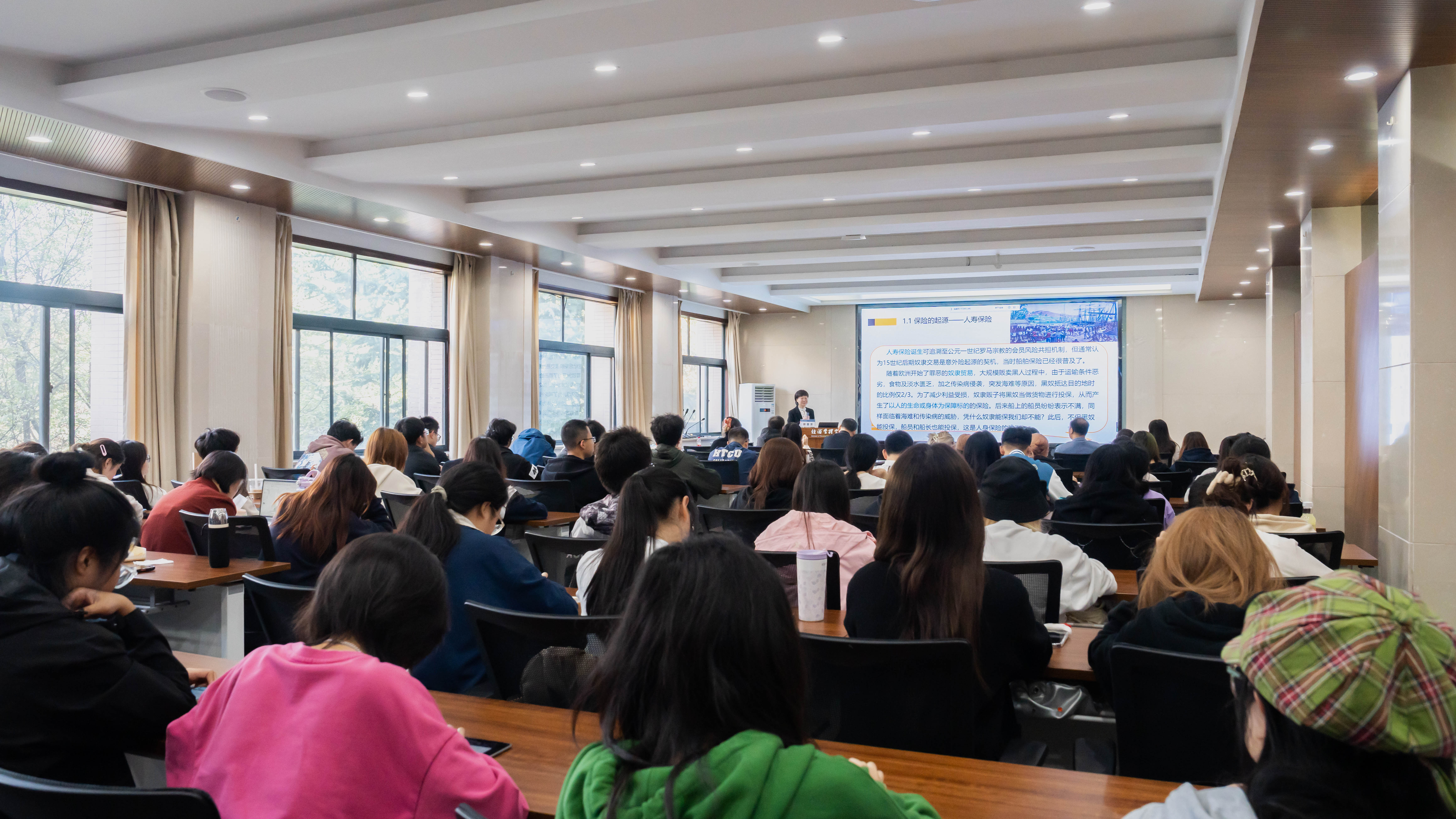 郭蓉芳在讲座中从保险业发展、金融监管现状、当前金融反腐的形式与要求、清廉金融文化建设工作进展与如何系好人生的第一粒纽扣五个方面出发,对保险的具体定义、分类主体与发展历程等做以明确区分和详细介绍,并引出金融监管工作的重要意义,在此基础上通过典型案例,深入浅出地从物质层面、制度层面、精神层面分别讲述了开展金融反腐的必要性、建设廉政文化的重要性与进一步推进相关工作的可行性。她谈到,广大青年学生作为未来金融行业的生力军,应当充分强化法纪意识,明白在纪律面前没有“‘商量着来’、‘情有可原’、‘下不为例’和‘法不责众’”,始终筑牢“纪律是铁、纪律是钢”的思想防线;要强化“清廉是福、贪欲是祸”的自律意识,珍惜国家的培养、自身的奋斗、家庭的幸福、自由的可贵,真正做到防微杜渐,拧紧思想“总开关”,把准行为的“定盘星”,坚持扣好人生每一粒“扣子”、走好人生每一步旅程,努力成为可堪大用、能担重任的栋梁之才。