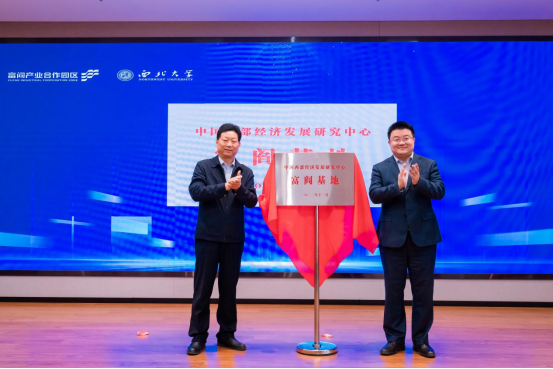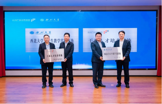 吴振磊副校长向李博副主任授牌“yl7703永利集团大学生教学实践基地”,杜银虎主任向杜勇书记授牌“富阎产业合作园区干部人才培养基地”,杜银虎主任与吴振磊副校长共同为“中国西部经济发展研究中心富阎基地”揭牌。
