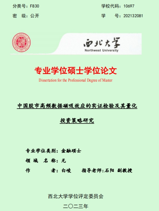 近日,由我院石阳副教授指导2021级金融专硕白峻同学撰写的硕士学位论文《中国股市高频数据磁吸效应的实证检验及其量化投资策略研究》,成功入选了中国金融专业学位论文中心(本年度全国共有34篇论文入选)。