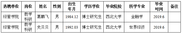 2019年3月27日下午14:00-15:00,我院在长安校区经管学院8号楼二层会议室,召开了选聘博士生试讲面试会议。面试小组由学校人事处委派的教学督导和我院相关专家组成。面试小组通过试讲、答辩及综合能力考察,结合我院近年来学科发展的重点,以及专业的需要,面试小组同意选聘以下2名博士毕业生来校任教,并经过2019年4月10日党政联席会议同意通过,现将本次拟选聘人员基本情况公示如下(公示期3天):