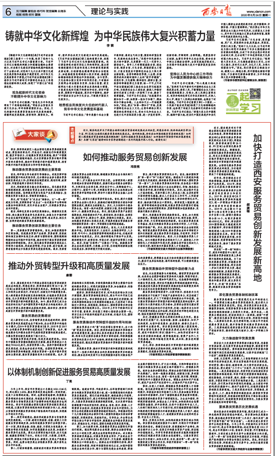 8月24日,《西安日报》的“理论与实践”版刊发了我院教师康蓉的文章《推动外贸转型升级和高质量发展》。近日,国务院发布关于同意全面深化服务贸易创新发展试点的批复,同意在西安、...