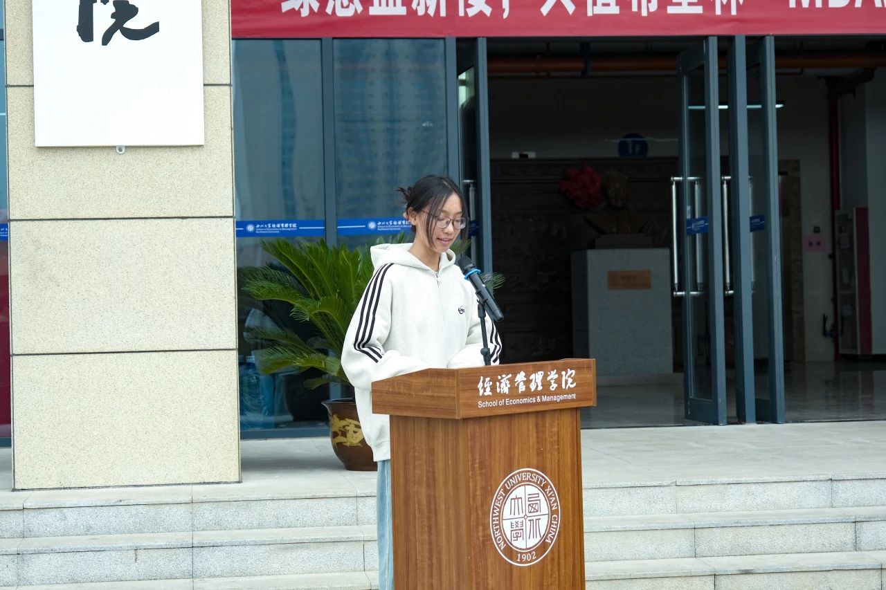 24级本科生代表王煜彤发言,她首先向捐赠树木的校友们表达了诚挚的感谢,并表示要以本次植树活动为契机,践行绿色发展理念,投身劳动教育实践,努力为美丽中国建设添砖加瓦。同时,要以各位优秀学长学姐为榜样,传承好经管学子知奋进、懂感恩的优良传统,齐心协力在助力学院高质量发展和投身民族伟大复兴的征程中绽放青春光彩!